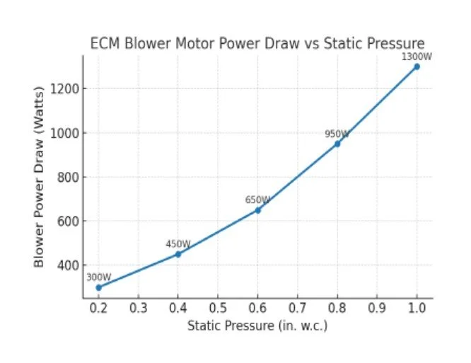 Power draw spikes as static pressure rises, which means more heat, more wear, shorter blower life, and higher energy bills.